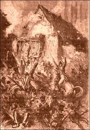 Bataille de Montmirail, lithographie d'après le tableau de Horace Vernet. Représentation de l'attaque finale sur Marchais par la division Ricard et deux bataillons de Vieille-Garde.