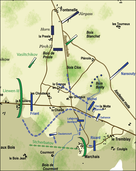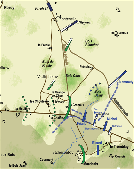 La contre-attaque française s’est déroulée très rapidement. Vers 16h00, Marchais est finalement aux mains de la division Ricard, trop réduite pour aller bien loin. La division Friant, à la Meulière, entame profondément le centre russe. Au nord, l’avant-garde du corps prussien a traversé Fontenelle vers 15h00. Sacken, sans doute ébranlé par le revirement de situation, a demandé des secours à Yorck afin de couvrir sa retraite et sauver ce qui peut encore l’être. Les Prussiens se dirigent par Presle sur les Grenaux. La partie n’est donc pas encore jouée.