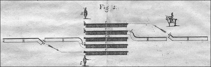 Le feu s’effectue sur deux rangs, le troisième devant recharger les armes pour le second. Or, contrairement ce que prescrit le Règlement, il semble que l’usage veuille que seuls les deux premiers rangs fassent feu à volonté. « Les feux de deux rangs ou feux de file sont absolument les seuls, à quelques mouvemens près, qui offrent, à l’infanterie bien exercée au maniement des armes, un avantage infiniment plus marquant que ceux précités. Le troisième rang, pendant la durée de ces feux, passe son arme à l’homme du deuxième rang : cet échange se fait avec répugnance, et celui-ci tire avec moins de confiance le fusil qu’il n’a pas chargé lui-même »[12].