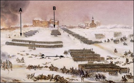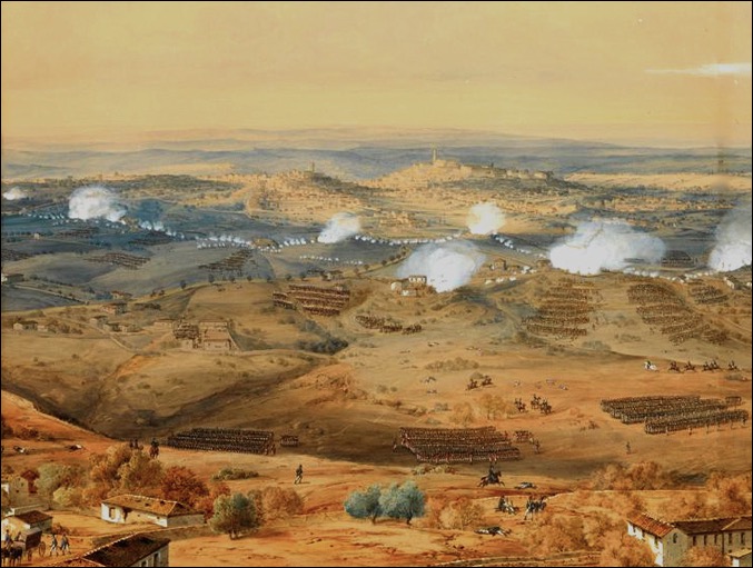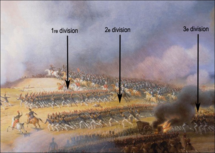Sur ce tableau de Théodore Jung représentant la Bataille d'Oporto, 29 mars 1809, 9 heures du matin, nous apercevons clairement au premier plan les bataillons en colonne en attente. D’autres bataillons, au milieu de la toile, se déplacent vers la ligne de bataille visible par l’écran de fumée blanche qui s’en dégage.